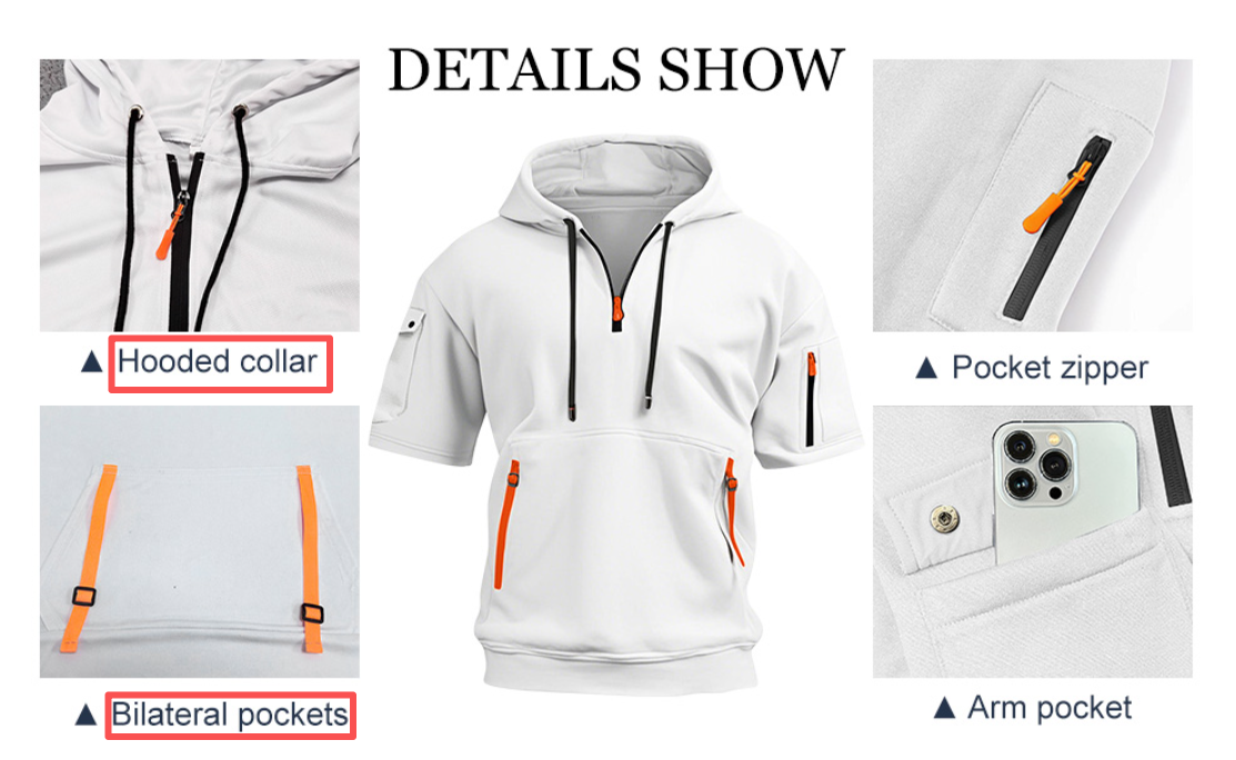 This men's short-sleeved hooded pullover is the perfect addition to your casual wardrobe. Blending an athletic aesthetic with functional design, it features a half-zip front, contrast pockets, and a hood for a versatile look. Whether you're working out, strolling around the city, or hanging out with friends, this pullover offers both style and comfort.